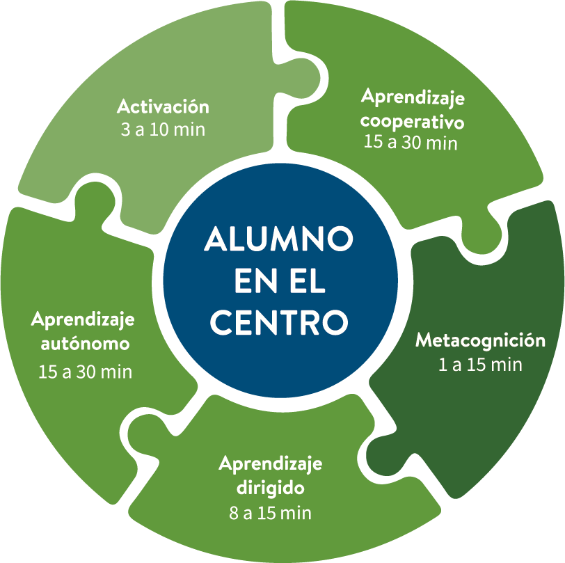 El modelo educativo sitúa al alumno en el centro, articulando distintas etapas de aprendizaje que equilibran la guía del maestro, la autonomía, el trabajo en equipo y la reflexión personal para fortalecer su formación integral.